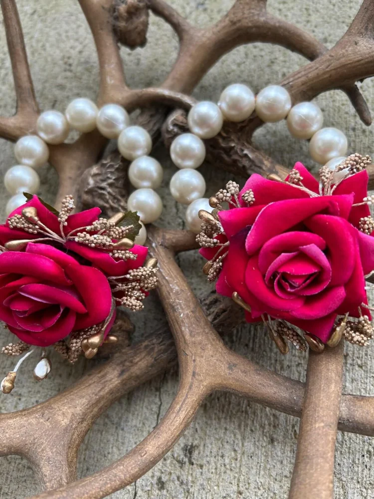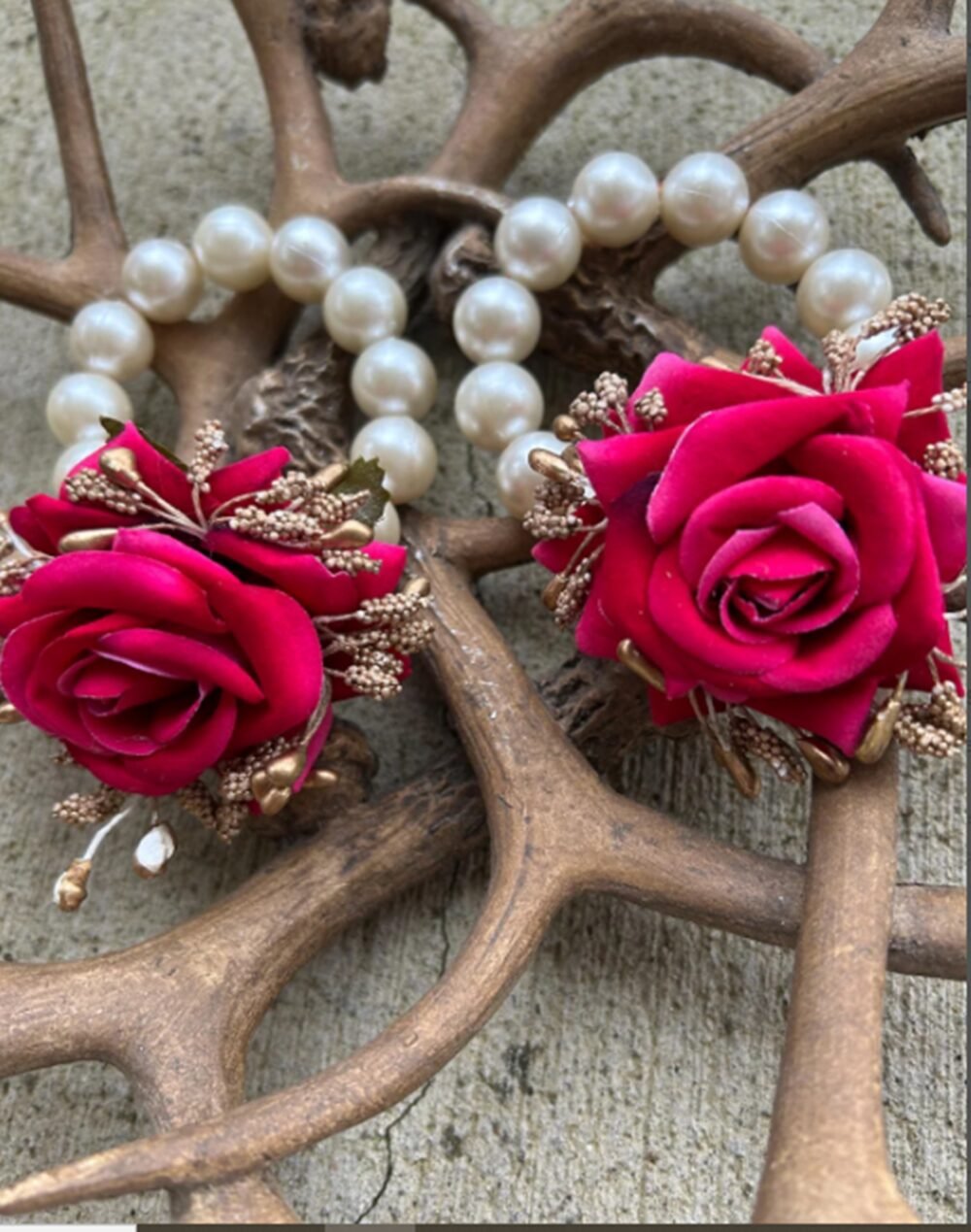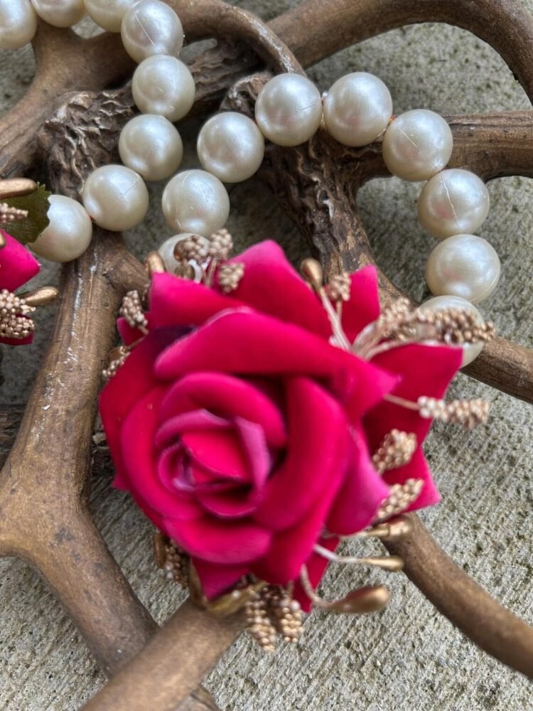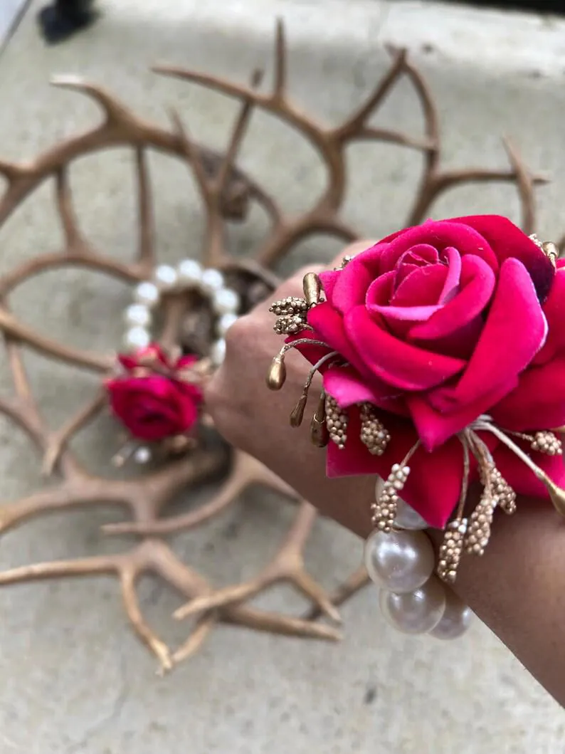 handcrafted flower bracelet. Featuring a vibrant deep pink rose centerpiece accented with delicate gold-toned buds and pearlescent beads, this piece blends romance and elegance in every detail.